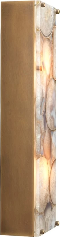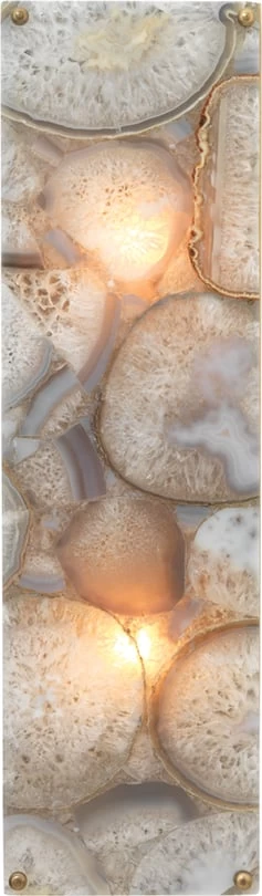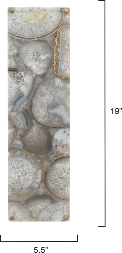 A collage of natural agate stone is joined together with clear resin and antique brass. This natural sculpture creates different colors and patterns within each piece, making it a truly one-of-a-kind piece in your home and on your wall.