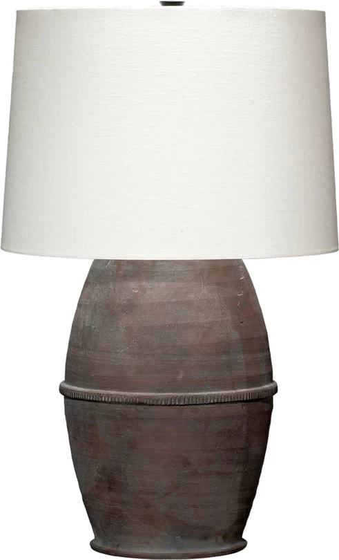 This large table lamp introduces an earthy tone and texture to a classic silhouette. The unique detail of a thin raised band draws attention to the body’s midline, and the dark grey ceramic of the lamp’s oversized body contrasts well with its clean white linen drum shade. This lamp is sure to make a substantial statement anywhere in your home, like an entry console or a dining room buffet.