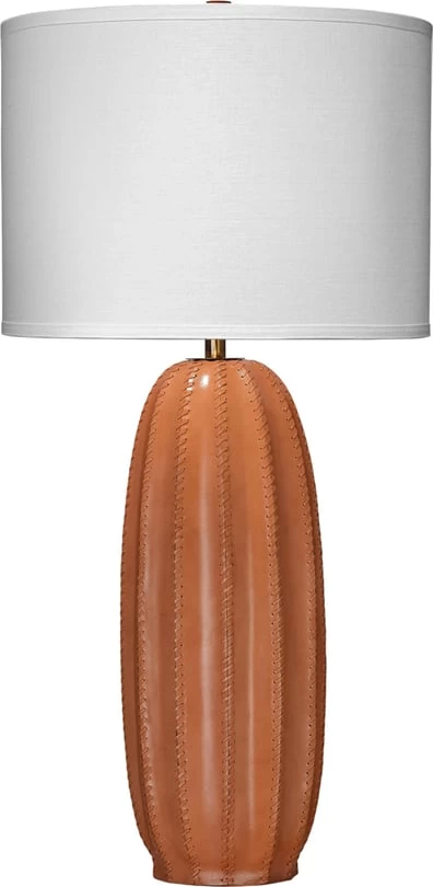 The unexpected use of leather updates this elevated take on a mid-century lamp. Visible stitching adds vertical detail to the rich brown leather covering the base and coordinating cylinder finial, and a white linen drum shade keeps the look clean. Modern and more than a touch masculine, this is the ideal addition to a den, home office, or mid-century inspired living area.