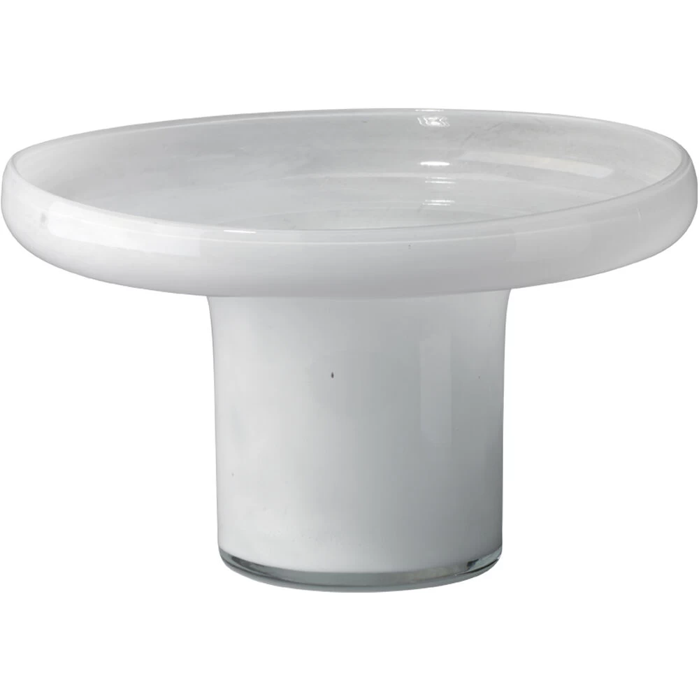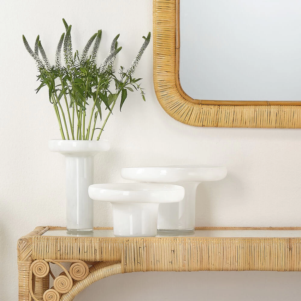 These vessels are each formed of handblown white glass, creating graceful silhouettes in varying heights and diameters. This set of three stunning vessels can hold a variety of decorative touches including plants, flowers, or even candles; your imagination is the limit. As the handblown pieces are created one at a time, no two will be identical; each is a unique work of art. Incorporate them into your home to make an elegant statement in any room.