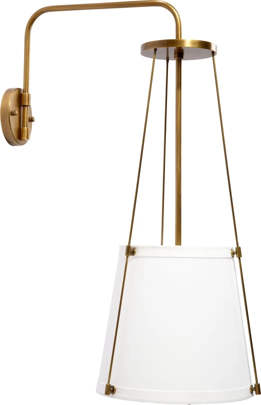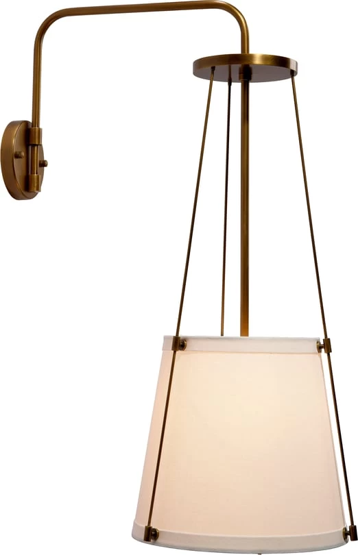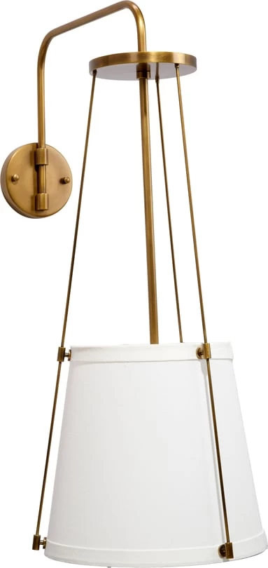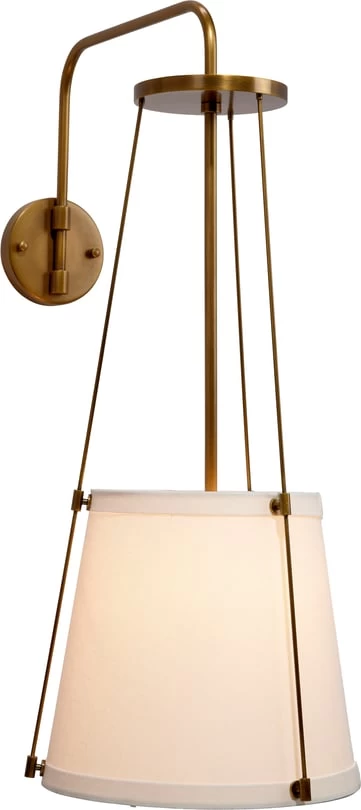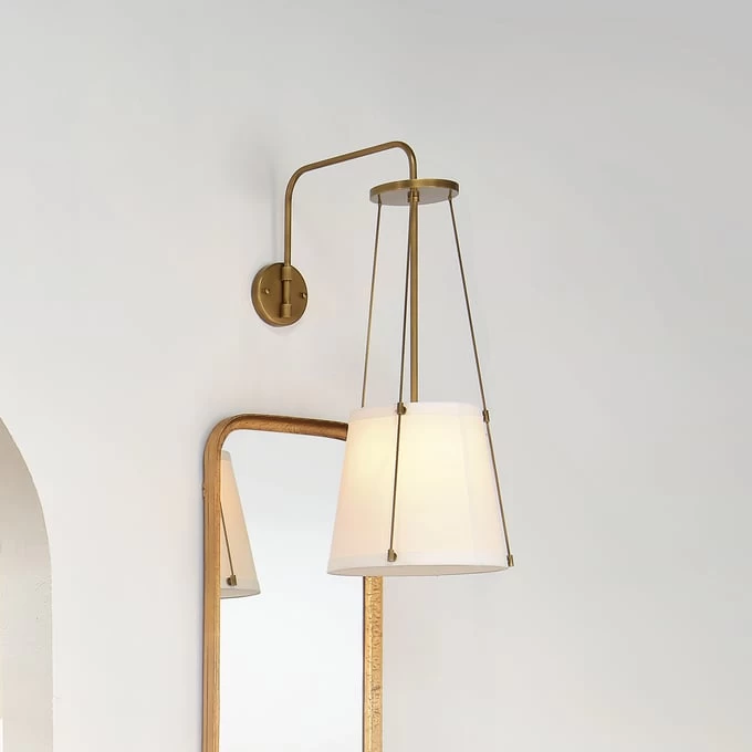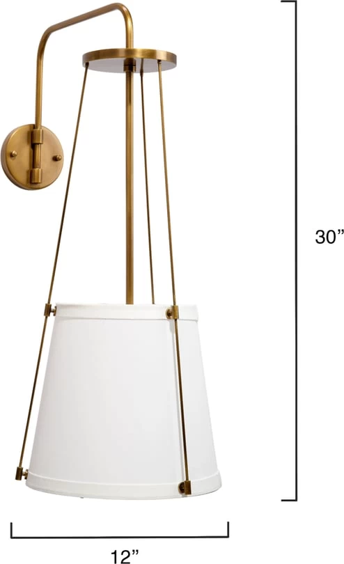 The sconce is suspended from a delicate metal framework with a modern metallic finish. Effortlessly appealing, it features an off-white drum shade in linen to softly diffuse its glow. Designer tip: display in pairs to flank a mirror, window, or doorway!