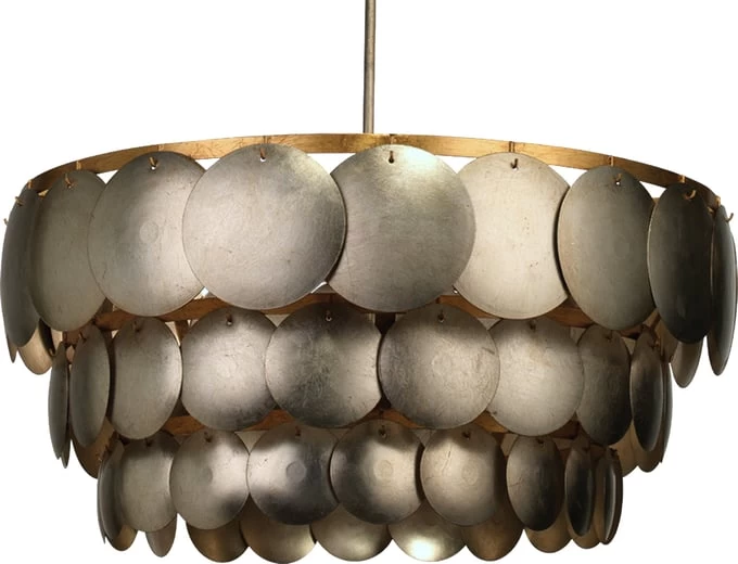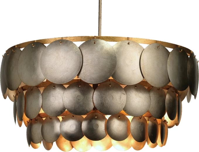 We love this chandelier and its two tones of metals. Hand leafed in a champagne finish with metal disks in three tiers makes this piece a really special statement.