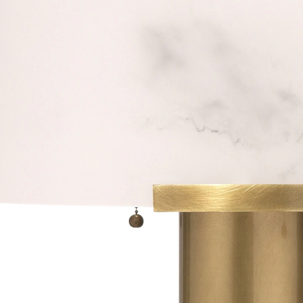 A contemporary take on a classic, Jamie Young’s twist on the traditional bank lamp showcase a clip-on white faux alabaster shade that has been hand-formed of high-quality resin. The metal base and pair of pull chains are finished in a softly antiqued brass and rest upon an acrylic base. As in natural alabaster, the markings and striations on the shade may vary.