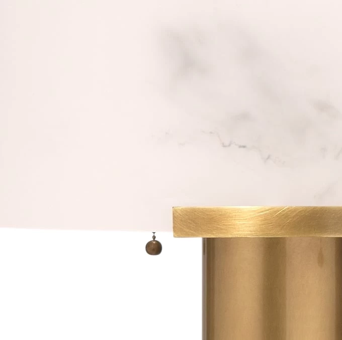 An oversized faux alabaster drum shade softens this sophisticated floor lamp. Crafted by hand from high quality resin, the delicate swirl patterns and veining of natural stone are recreated carefully and are unique to each piece. The metal base that supports it all is finished in antiqued brass, as are the pulls for the two bulbs that allow for personalized levels of lighting. A circle of acrylic at the base anchors it all.