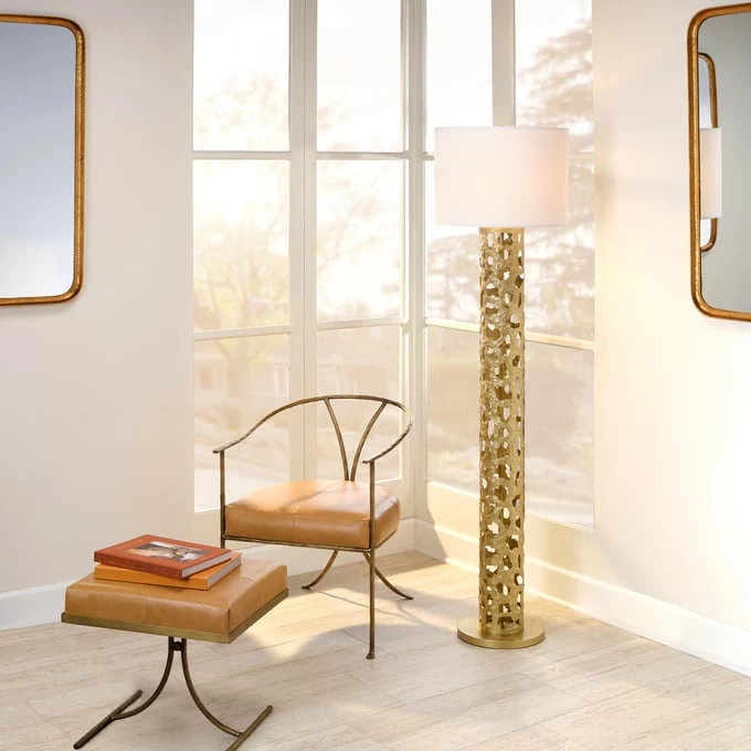 Tempering Italian opulence with a dash of Southern Californian charm, the Firenze lighting collection adds more than just light. Each piece is expertly crafted and finished by hand. The metal bases feature intricate, organically inspired cut-outs and richly textured finishes. Available in gold leaf or white on white, each is topped with a white linen shade and coordinating cylindrical finial.