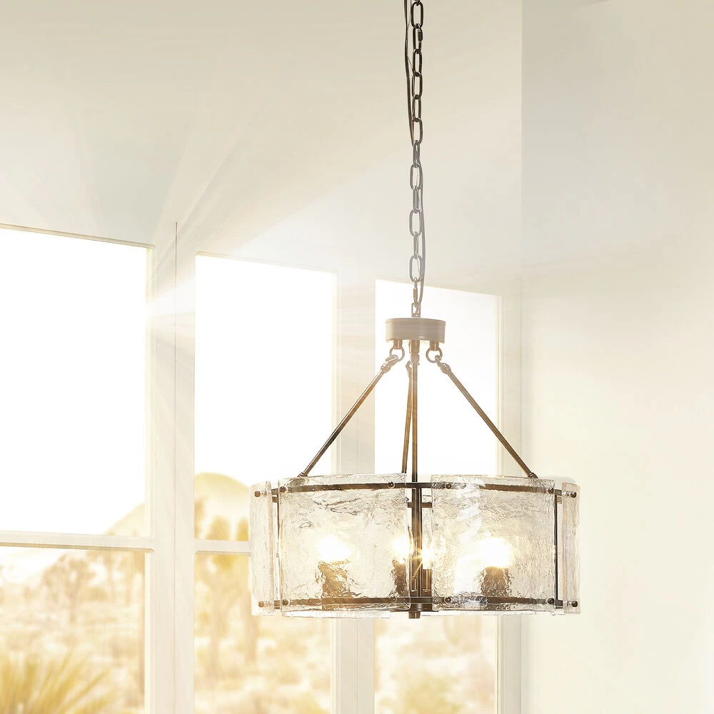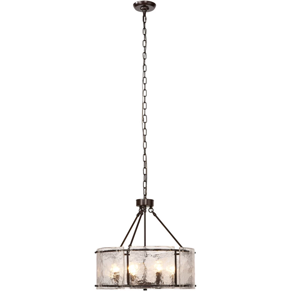 A refined study in contrasts, this striking chandelier features a softly curved slice of icelike glass that softens and diffuses the “flame” of the bulbs behind it. A smooth oil-rubbed bronze canopy and chain perfectly complement the richly textured glass. Sophisticated yet simple, this is a beautiful choice for a modern interior.