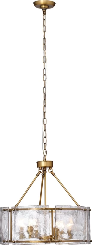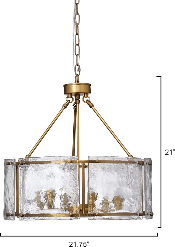 A refined study in contrasts, this striking chandelier features a softly curved slice of ice-like glass that softens and diffuses the “flame” of the bulbs behind it. A burnished antiqued brass canopy and chain perfectly complement the richly textured glass. Sophisticated yet simple, this is a beautiful choice for a modern interior.