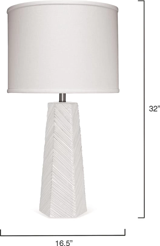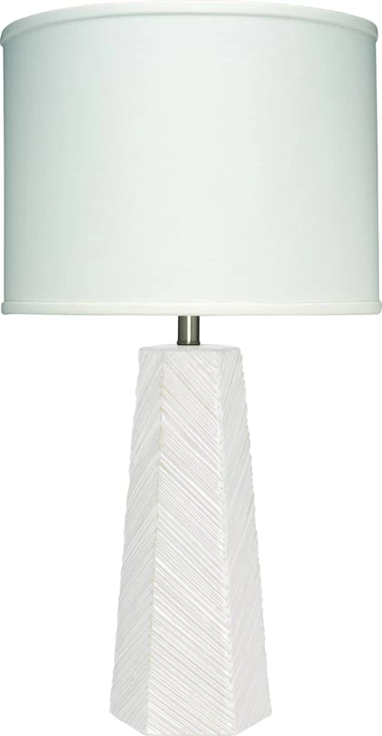 This architectural table lamp stands at cloud scraping 31″ tall. The chevron texture on the ceramic surface adds to the natural, creamy finish, making it a great casual lamp for any room.