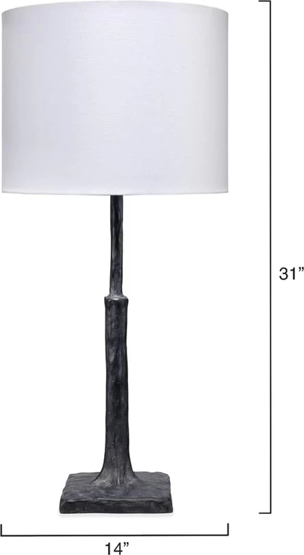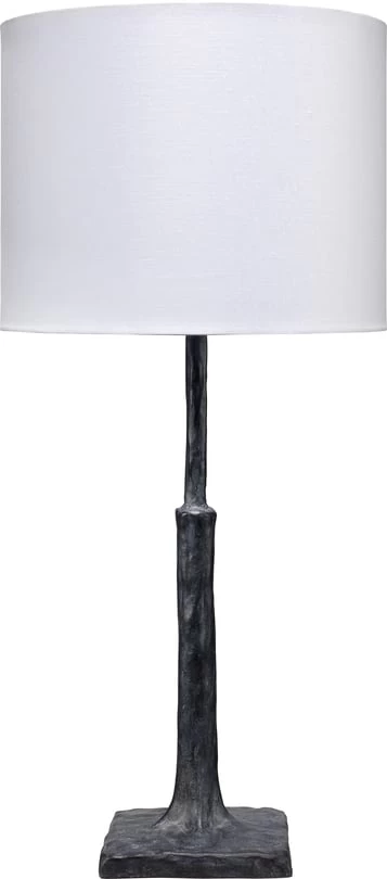 The Humble Desk Lamp is a slender tabletop lamp made from poly-resin plaster with a textured charcoal finish. The richly textured base of the lamp lends it a hand-done appeal, and its white linen drum shade and coordinating finial add refinement.
