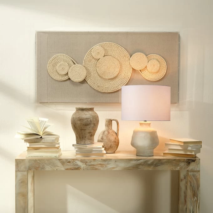 The unrefined shape of this petite table lamp’s body adds an atmosphere of comfortable warmth to any home. Formed with eggshell ceramic, the natural curves and dimples of the hand-molded body give the impression of unglazed clay with a soft matte finish. The table lamp’s understated white-on-white color palette is designed to complement a variety of décor styles, from coastal to contemporary.