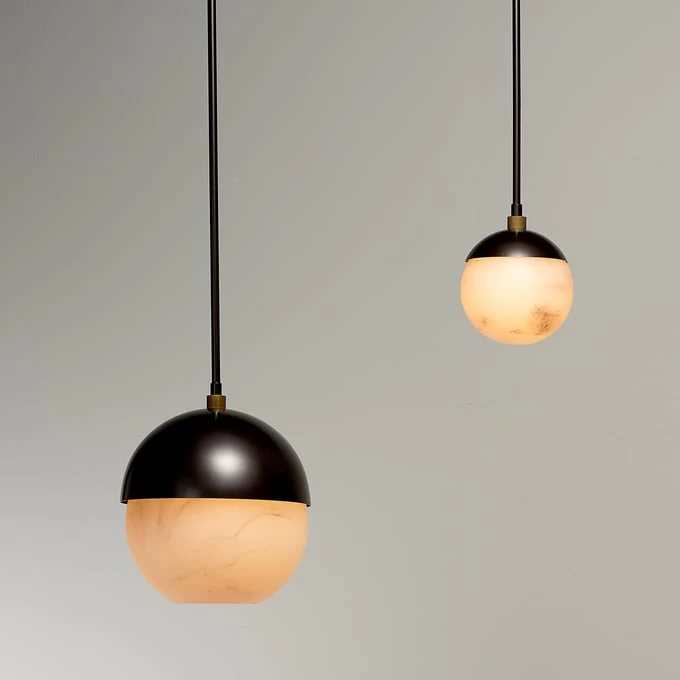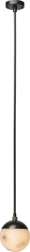 Spherical faux alabaster shades that soften and diffuse the lightbulbs hidden within are paired with oil rubbed bronze bases and hardware in these sleek pendant lamps from the Metro Collection. Their mid-century inspiration is injected with a decidedly urban zest, and they are available in three distinct styles perfect for grouping. The delicate swirl patterns and veining of natural stone in each shade are recreated carefully by hand from high quality resin and are unique to each piece. Professional installation is recommended.