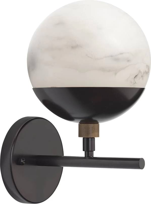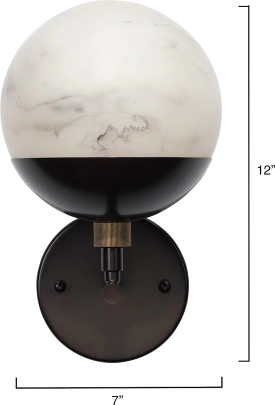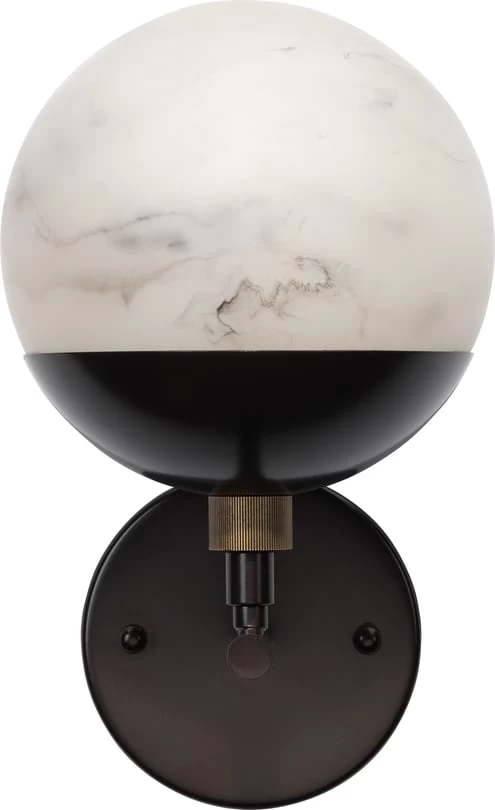 Spherical faux alabaster shades that soften and diffuse the bulbs within are paired with oil rubbed bronze bases and hardware in these sleek sconces from the Metro Collection. Their mid-century inspiration is injected with a decidedly urban zest. The line also includes several striking pendant options! The delicate swirl patterns and veining of natural stone in each shade are recreated carefully by hand from high quality resin and are unique to each piece. Professional installation is recommended.