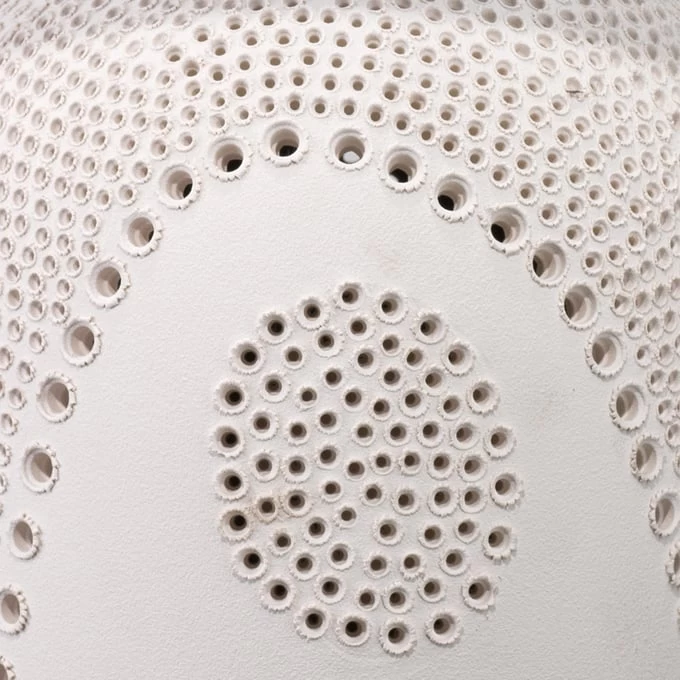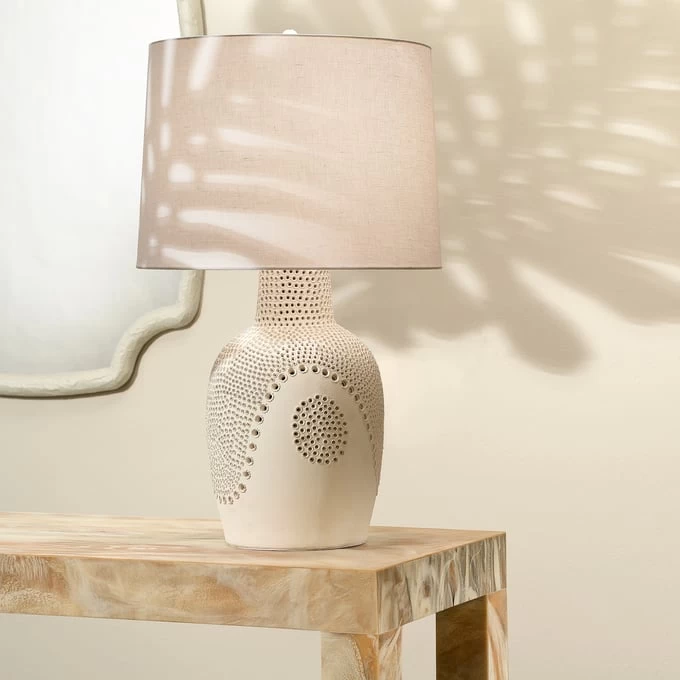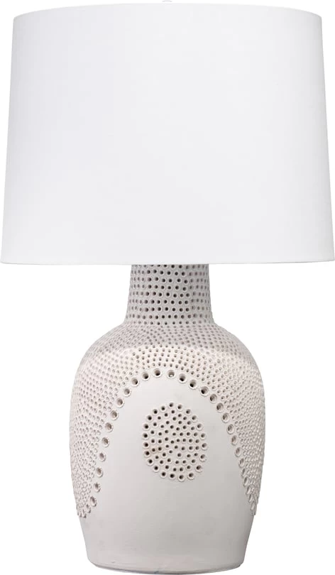 Offering a romanticized representation of the queen of the night sky rising into a tapestry of stars, this lamp is subtle but spectacular. It is topped with a linen rolled-edge tapered shade in white and an acrylic ball finial; the socket and 3-way turn knob are silver. The perforated celestial-inspired patterns on the porcelain base are created by hand and may vary slightly, ensuring each is an individual work of art. Ideal for any contemporary décor, the Moonrise lamp is available in your choice of Matte Black or Matte White.