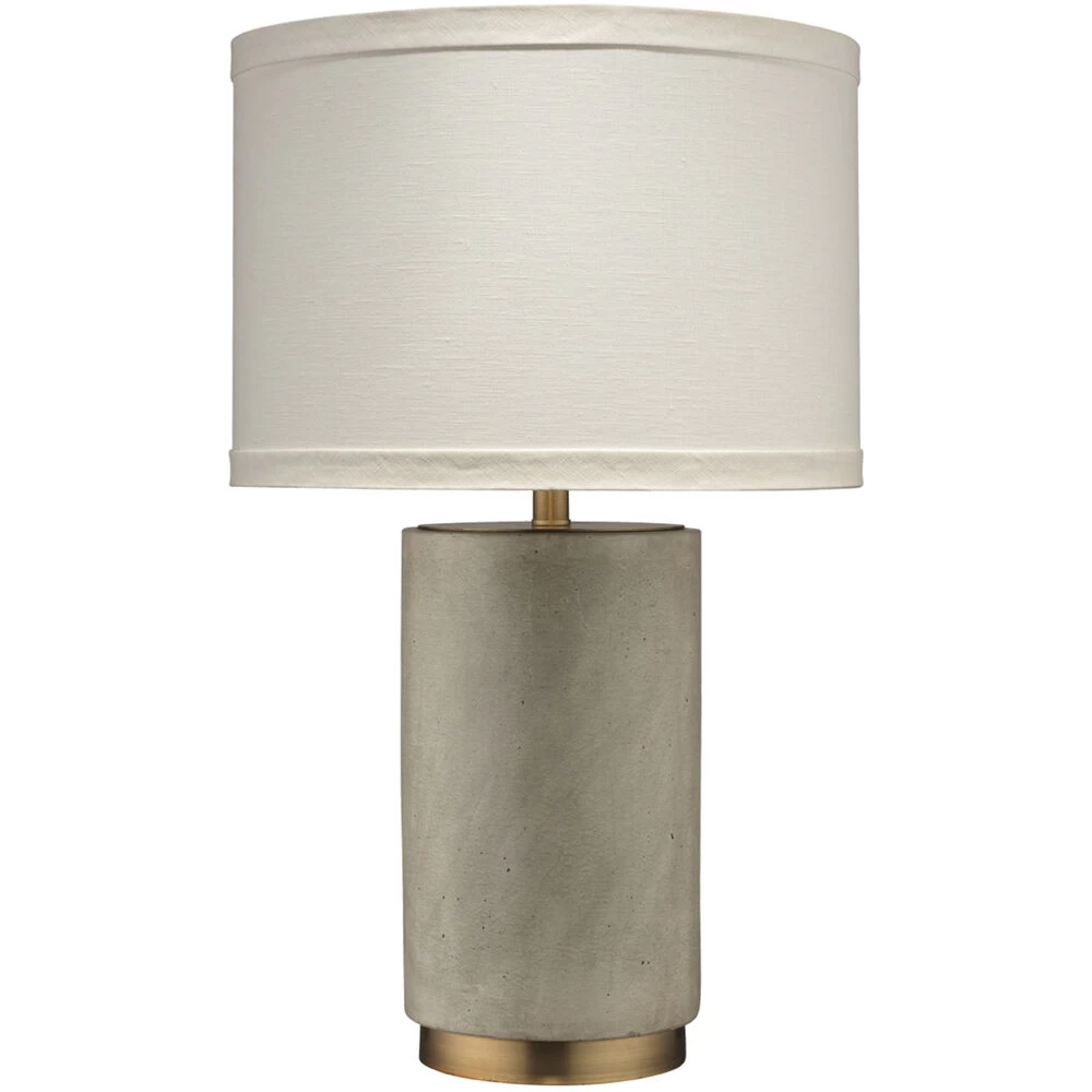 Antique brass details add warmth to a crisp and modern cement body to create this perfect lamp for any home. The thick, indented brass base design is replicated with considered thought on a perfectly trimmed linen shade with matching details.Natural cement, finish may vary.