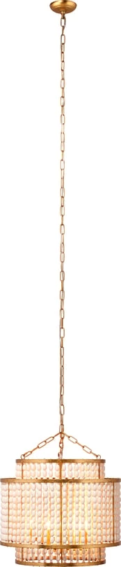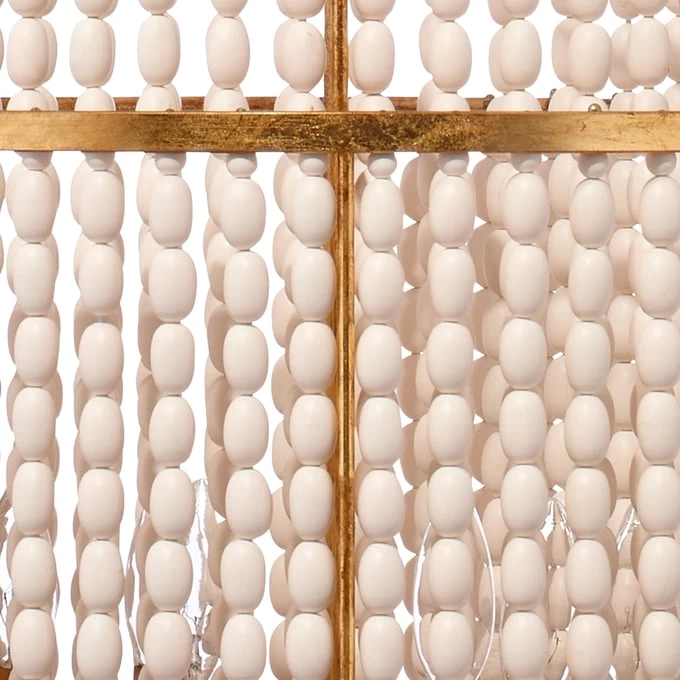 Cascading strands of carved wood beads flow gracefully to create the “shade” in this astonishingly lovely chandelier. The tiers of antique white beads are suspended from an iron frame finished in burnished gold, which adds strong lines and contrasts expertly with the softness of the interior beading. As the beads are carved from natural wood, the finish and striations on each will vary slightly. A unique blend of vintage and modern, this intriguing piece was designed to be easily integrated into a multitude of décor styles. The fixture is suspended from a coordinating eight-foot chain in gold, and professional installation is recommended.