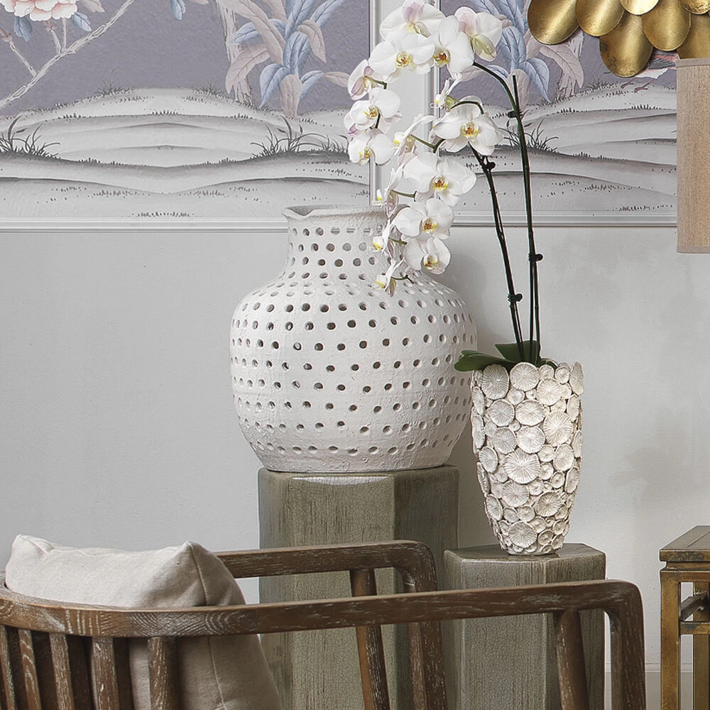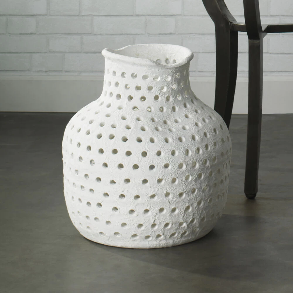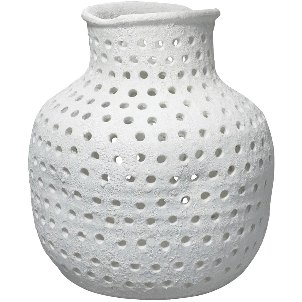An uncommon pierced softly organic ceramic vase with a rustic white glaze.