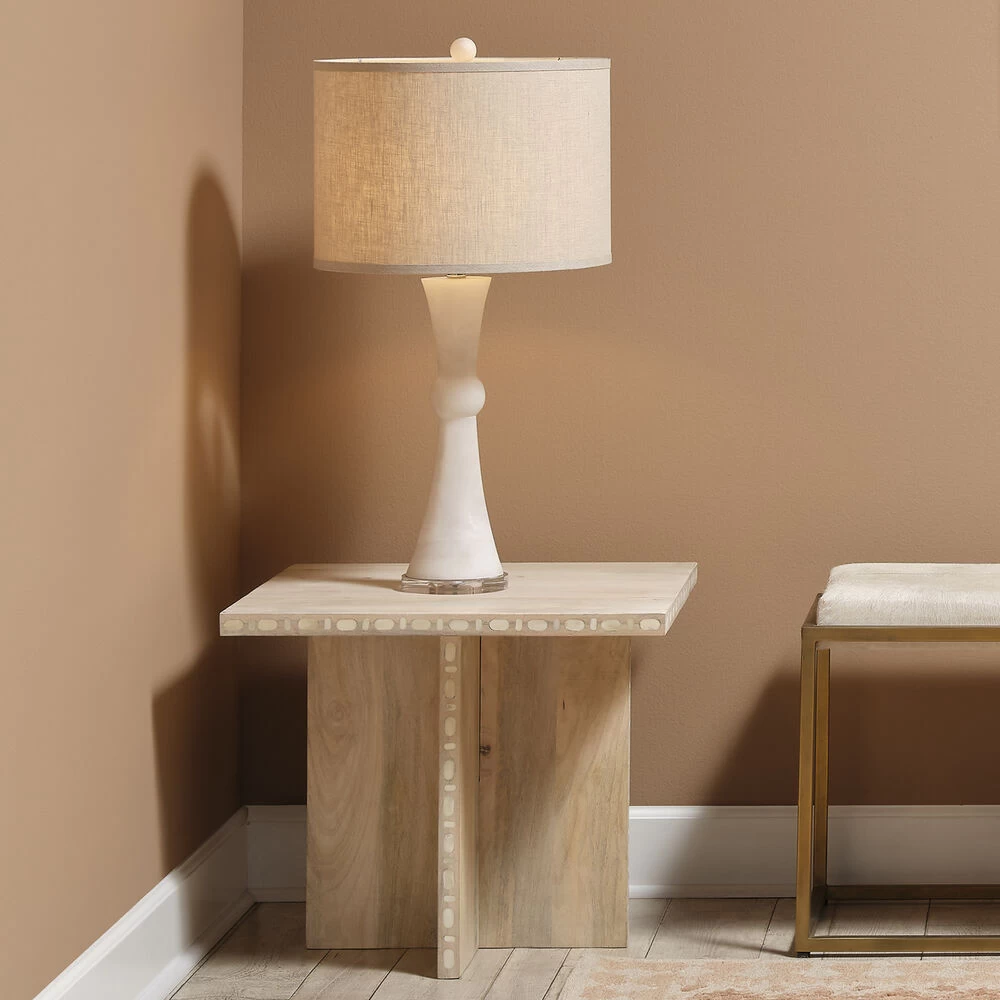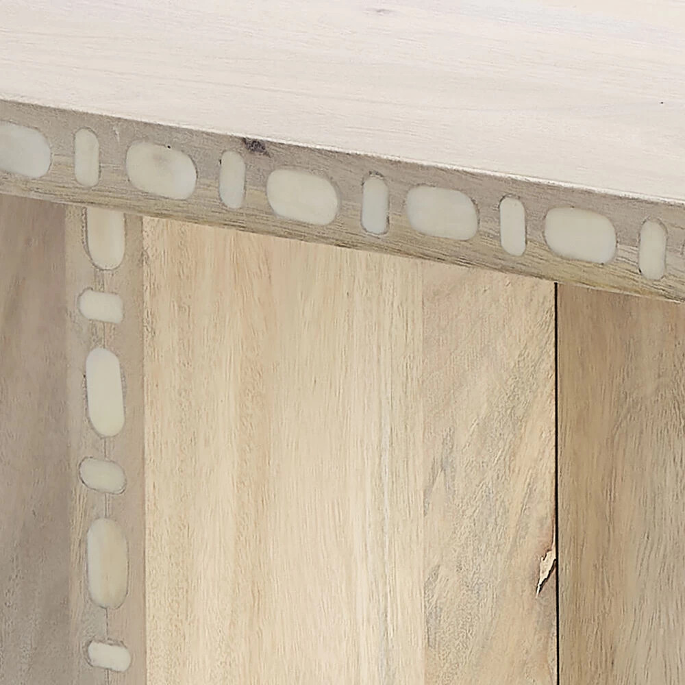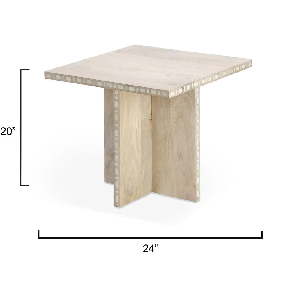 Deceptively simple, this contemporary accent table is distinguished by its clean lines, sharp angles, and subtle ornamentation. Each piece is expertly artisan crafted of sustainably harvested mango wood and hand-finished with a clean white patina. Edges are embellished with genuine bone inlay. To protect your fine floors, the legs are tipped in black felt. A modern take on a tropical theme, these are refined pieces for today’s casual interiors.