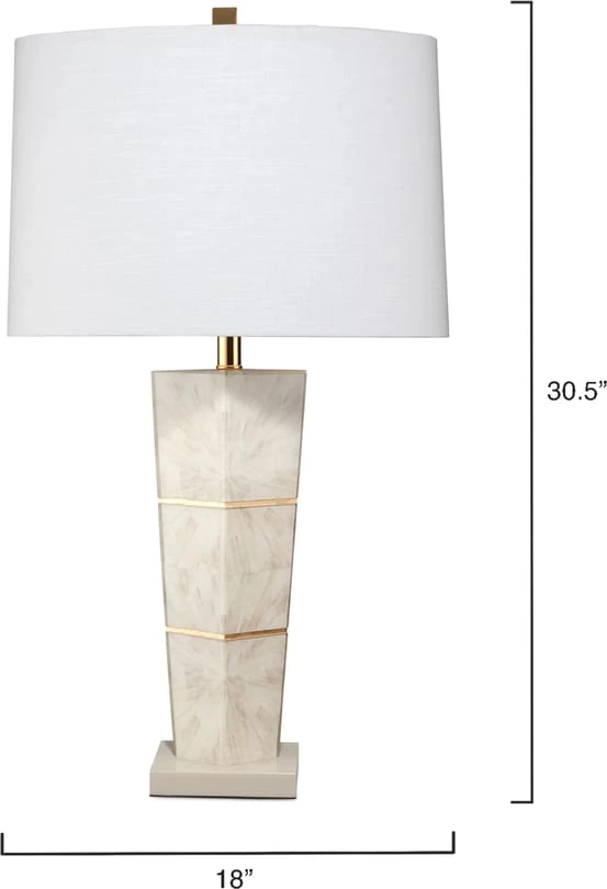 With all the spectacular beauty of natural burnished horn but none of the cruelty, the bases of these lamps dazzle. The horn inspired patterns are expertly artisan created from layers of soft gray lacquer and then accented with rings of genuine gold leaf. A tapered shade in creamy white linen and a cubed cylinder finial in more rich gold leaf are included.