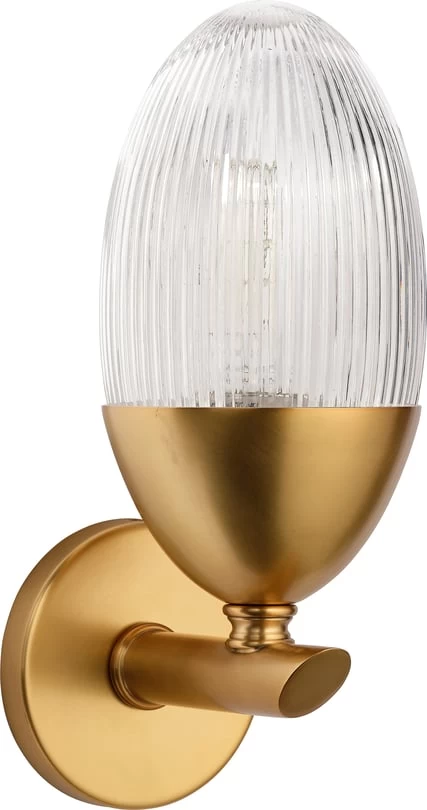 The warmth of pholised brass pairs eloquently with thick, ribbed glass in this elevated wall sconce. They can be installed facing up or down, and are compatible with dimmer switches, allowing you to customize the look. Choose exactly how much light you want, and where you want it! These are especially impactful when displayed in multiples; place one on either side of a bookcase or entertainment unit, or use several to light a long hallway.